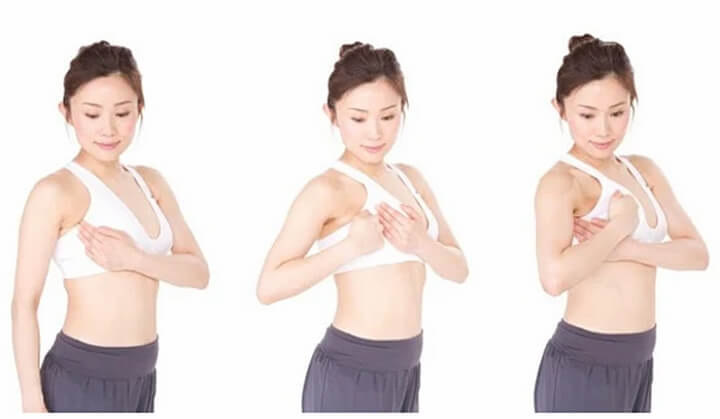 - Nâng ngực trái bằng tay trái, dùng tay phải xoa bóp ngực trên theo chuyển động tròn.