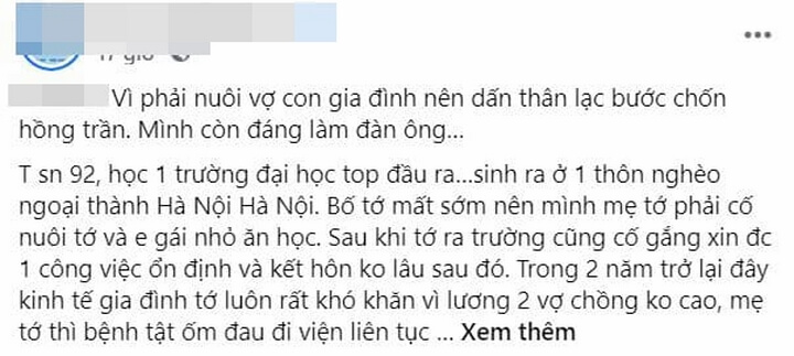 Tớ sinh năm 92, học 1 trường đại học top đầu ra… sinh ra ở 1 thôn nghèo ngoại thành Hà Nội . Bố tớ mất sớm nên mình mẹ tớ phải cố nuôi tớ và em gái nhỏ ăn học. Sau khi tớ ra trường cũng cố gắng xin được công việc ổn định và kết hôn không lâu sau đó. Trong 2 năm trở lại đây kinh tế gia đình tớ luôn rất khó khăn vì lương 2 vợ chồng không cao, mẹ tớ thì bệnh tật ốm đau đi viện liên tục nên tớ phải thay mẹ nuôi em ăn học.