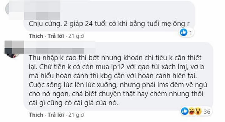 Thu nhập không cao thì bớt nhưng khoản chi tiêu không cần thiết lại. Chứ tiền không có còn mua Iphone 12 với quần áo túi xách làm gì, vợ bạn mà hiểu hoàn cảnh thì không bao giờ cần với hoàn cảnh hiện tại. Cuộc sống lúc lên lúc xuống, nhưng phải làm đêm về ngủ cho nó ngon, chả biết chuyện thật hay chém nhưng thôi cái gì cũng có cái giá của nó…