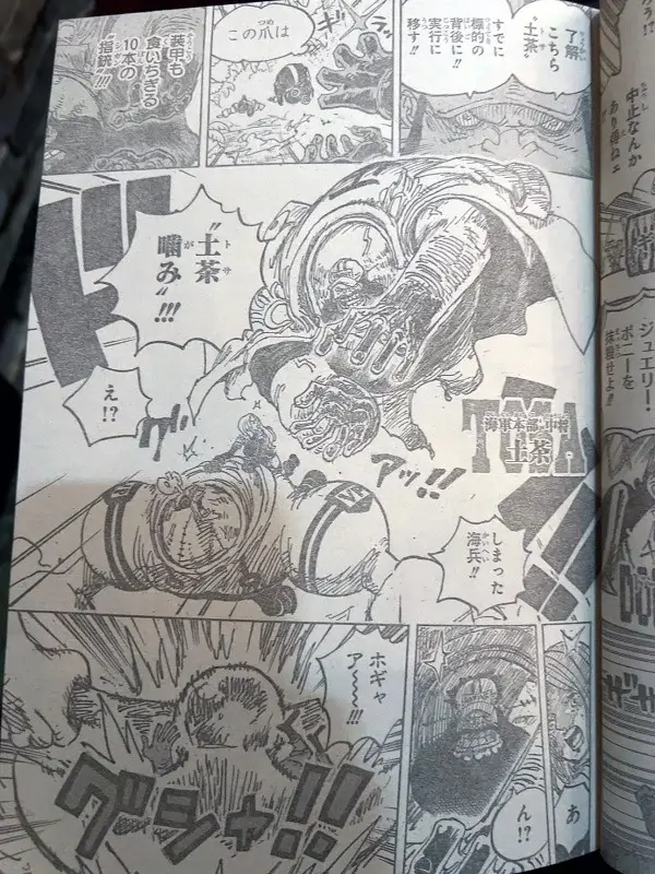 Trong trang đôi cuối cùng của chương Luffy nắm lấy đầu của Saturn bằng tay trái và toàn bộ cơ thể Kizaru bằng tay phải cùng lúc. Kizaru ho ra máu khi bị Luffy tóm lấy.