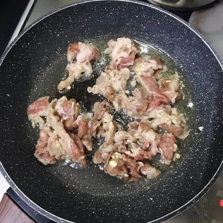 Bắc chảo lên bếp, cho vào 2 muỗng canh dầu ăn, đợi dầu nóng cho thịt bò vào xào đều tay với lửa lớn, tầm khoảng 1 phút khi thịt đã chín sơ và săn lại, trút phần thịt ra đĩa.